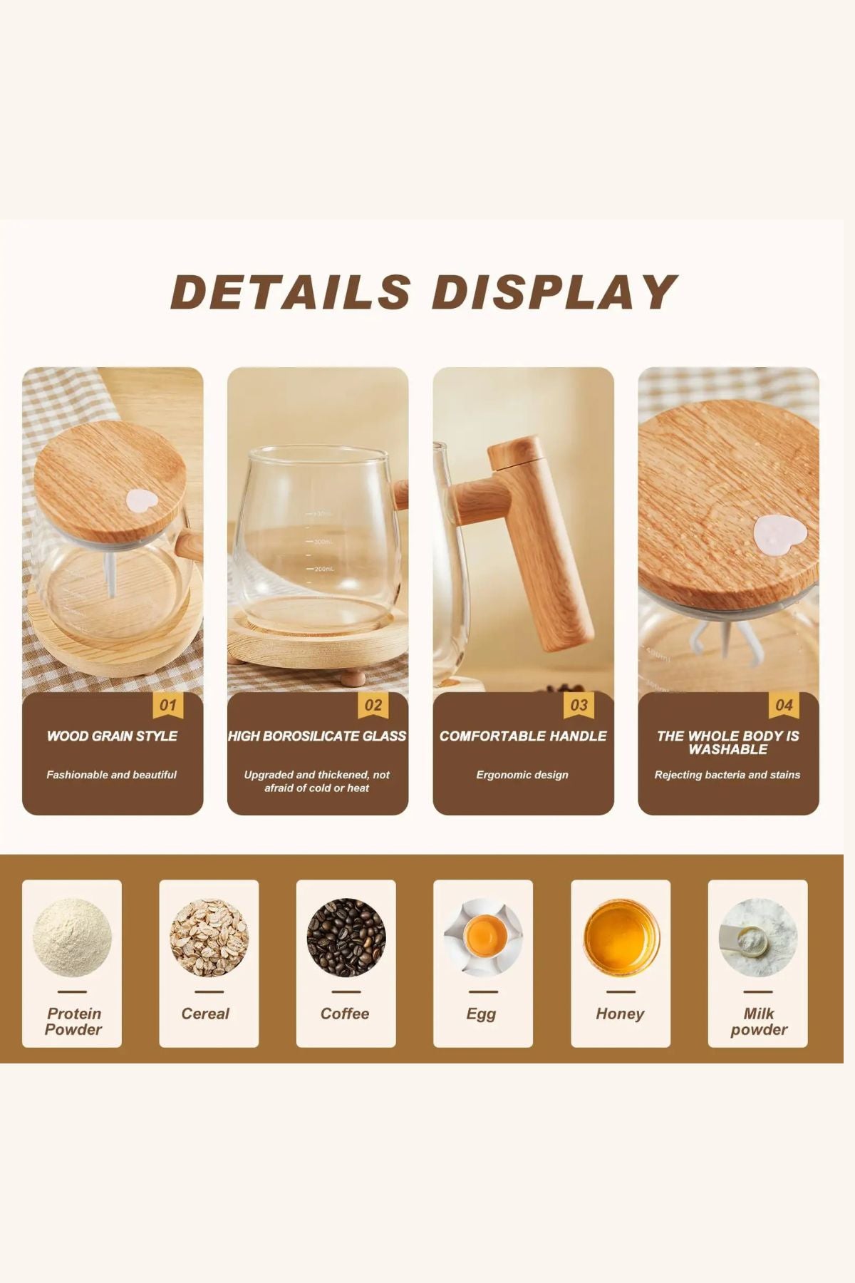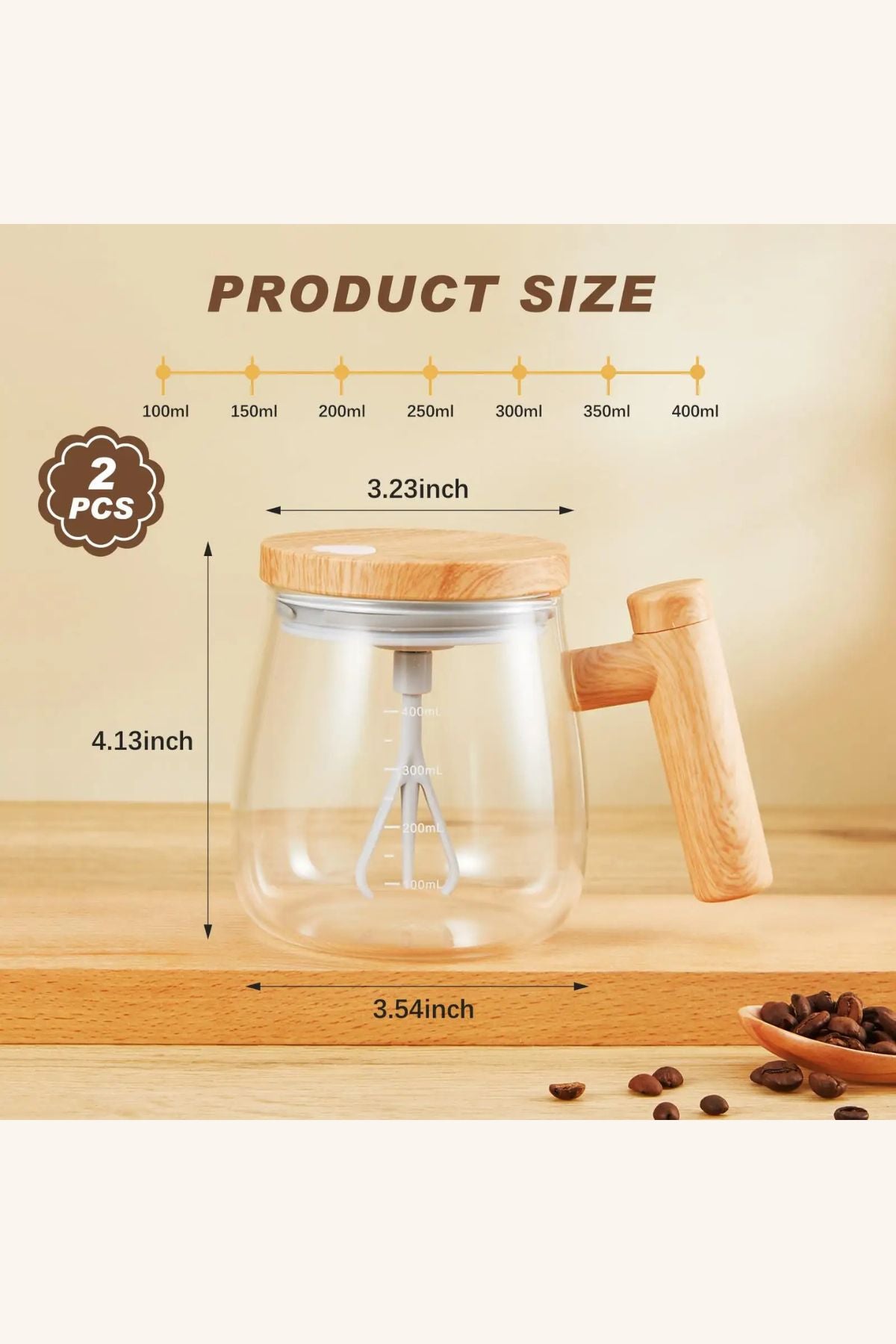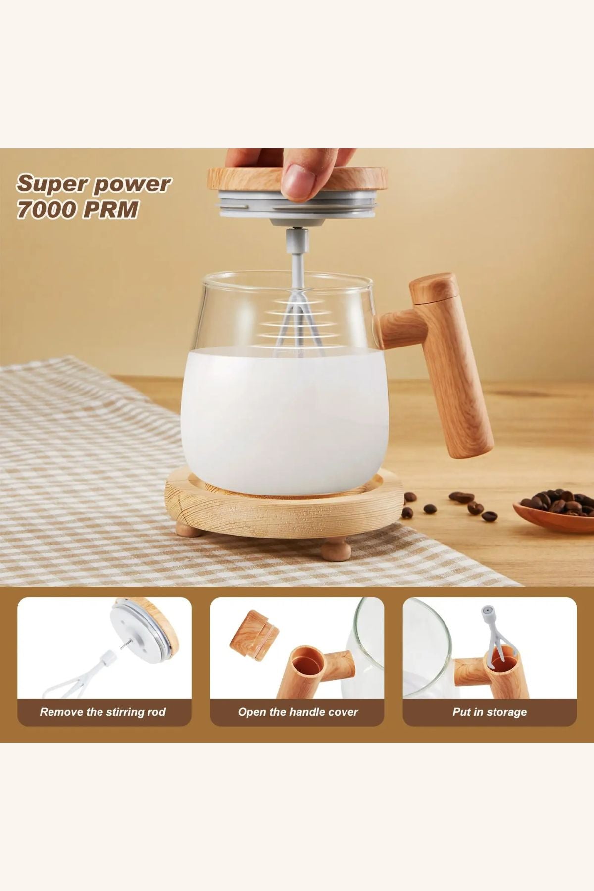 كوب مبتكر بغطاء يحتوي على محرك داخلي يعمل بالبطاريات لتحريك المشروب تلقائيًا بضغطة زر واحدة. تصميمه الزجاجي الفاخر مع مقبض خشبي مريح يمنحك تجربة شرب أنيقة وسهلة.